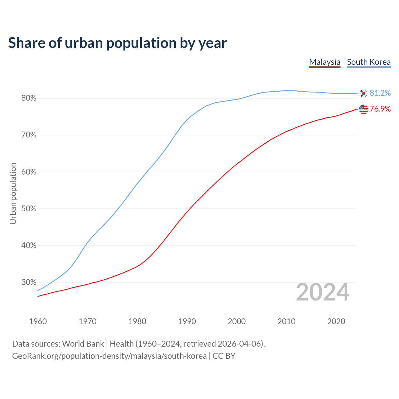 From 2004 to 2024, the share of urban population changed from 66.1% to 76.9% in Malaysia and from 81.1% to 81.2% in South Korea.