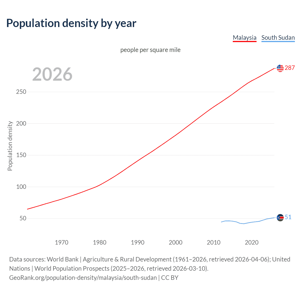 Malaysia has a population density of 287 people per square mile compared to 51 people in South Sudan. Malaysia has 100,140 sq ft of land per person vs 580,697 sq ft in South Sudan. Malaysia and South Sudan rank 85th and 171st by population density, respectively.