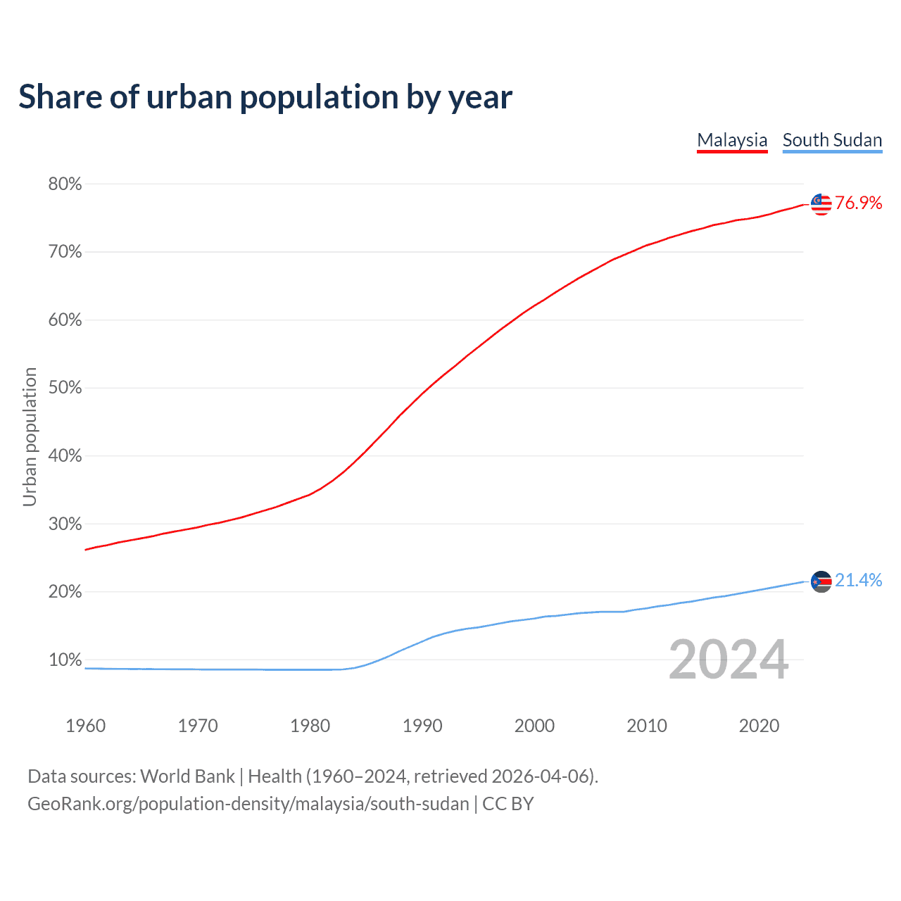 From 2004 to 2024, the share of urban population changed from 66.1% to 76.9% in Malaysia and from 16.8% to 21.4% in South Sudan.
