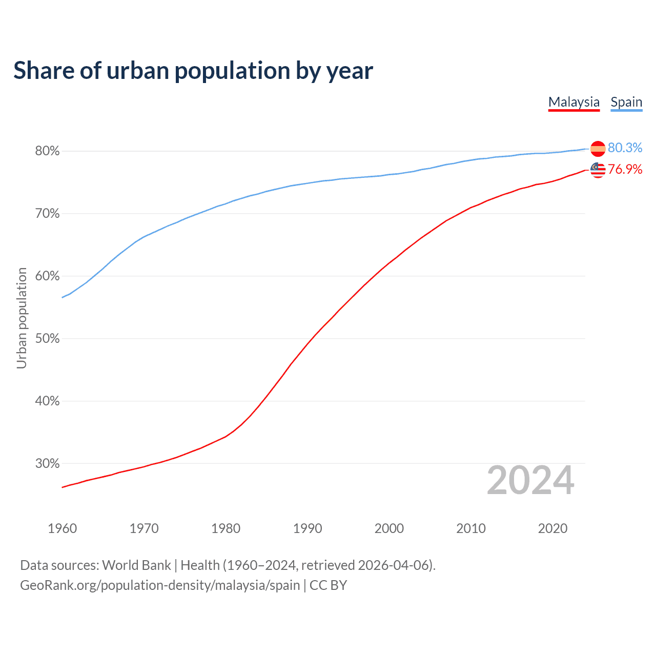 From 2004 to 2024, the share of urban population changed from 66.1% to 76.9% in Malaysia and from 77% to 80.3% in Spain.