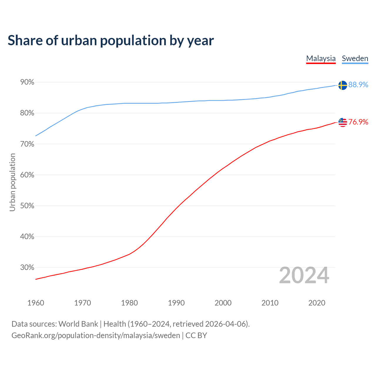 From 2004 to 2024, the share of urban population changed from 66.1% to 76.9% in Malaysia and from 84.3% to 88.9% in Sweden.