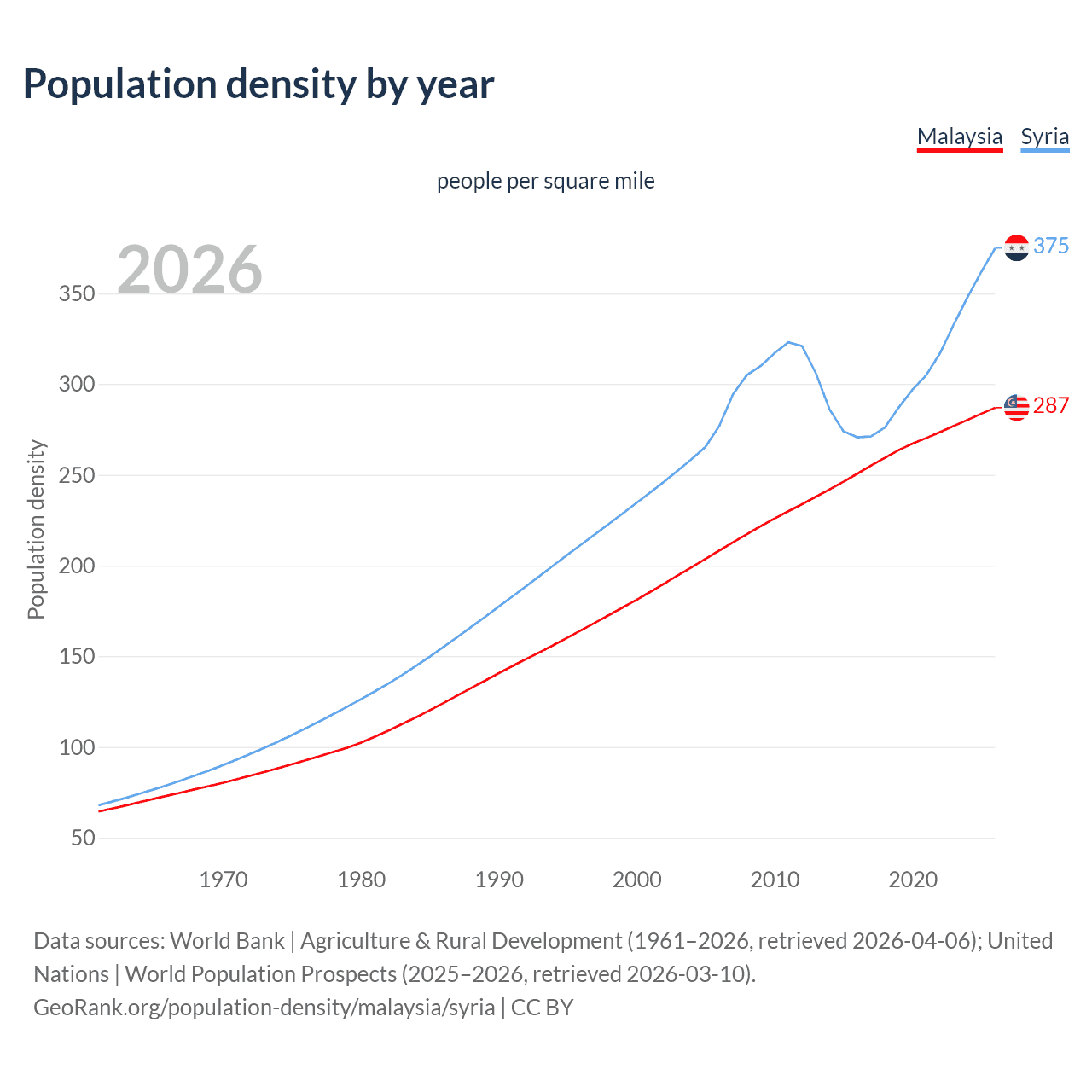 Malaysia has a population density of 287 people per square mile compared to 375 people in Syria. Malaysia has 100,140 sq ft of land per person vs 80,788 sq ft in Syria. Malaysia and Syria rank 85th and 68th by population density, respectively.