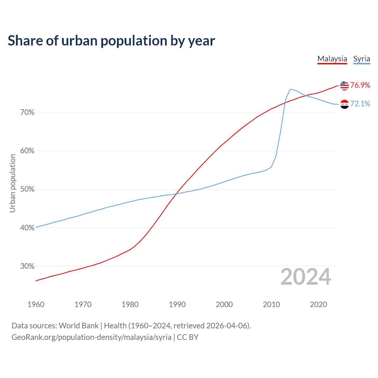 From 2004 to 2024, the share of urban population changed from 66.1% to 76.9% in Malaysia and from 53.5% to 72.1% in Syria.