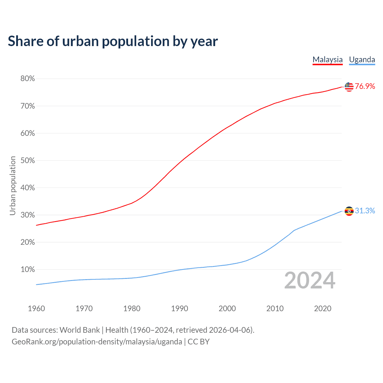 From 2004 to 2024, the share of urban population changed from 66.1% to 76.9% in Malaysia and from 13.1% to 31.3% in Uganda.
