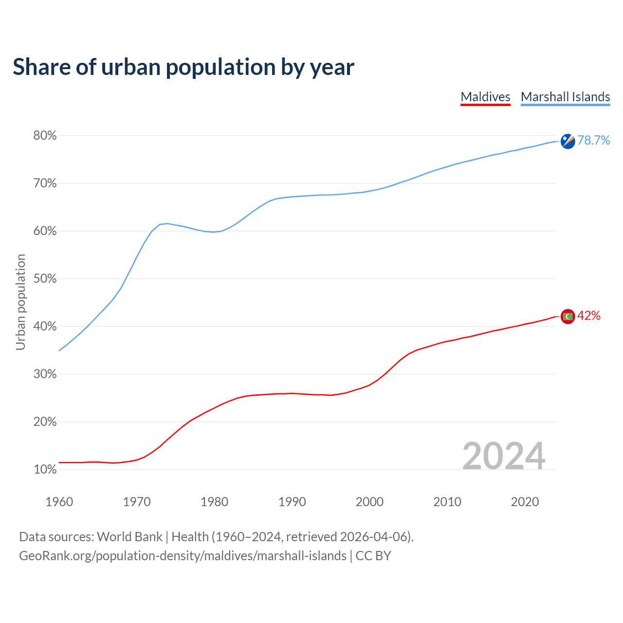 From 2004 to 2024, the share of urban population changed from 32.9% to 42% in Maldives and from 70.1% to 78.7% in the Marshall Islands.