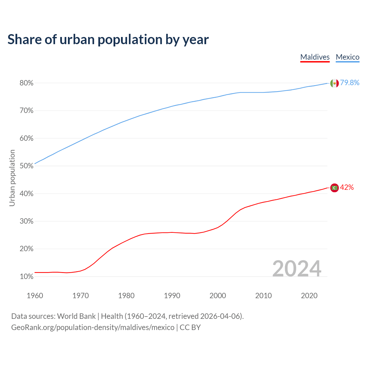 From 2004 to 2024, the share of urban population changed from 32.9% to 42% in Maldives and from 76.3% to 79.8% in Mexico.