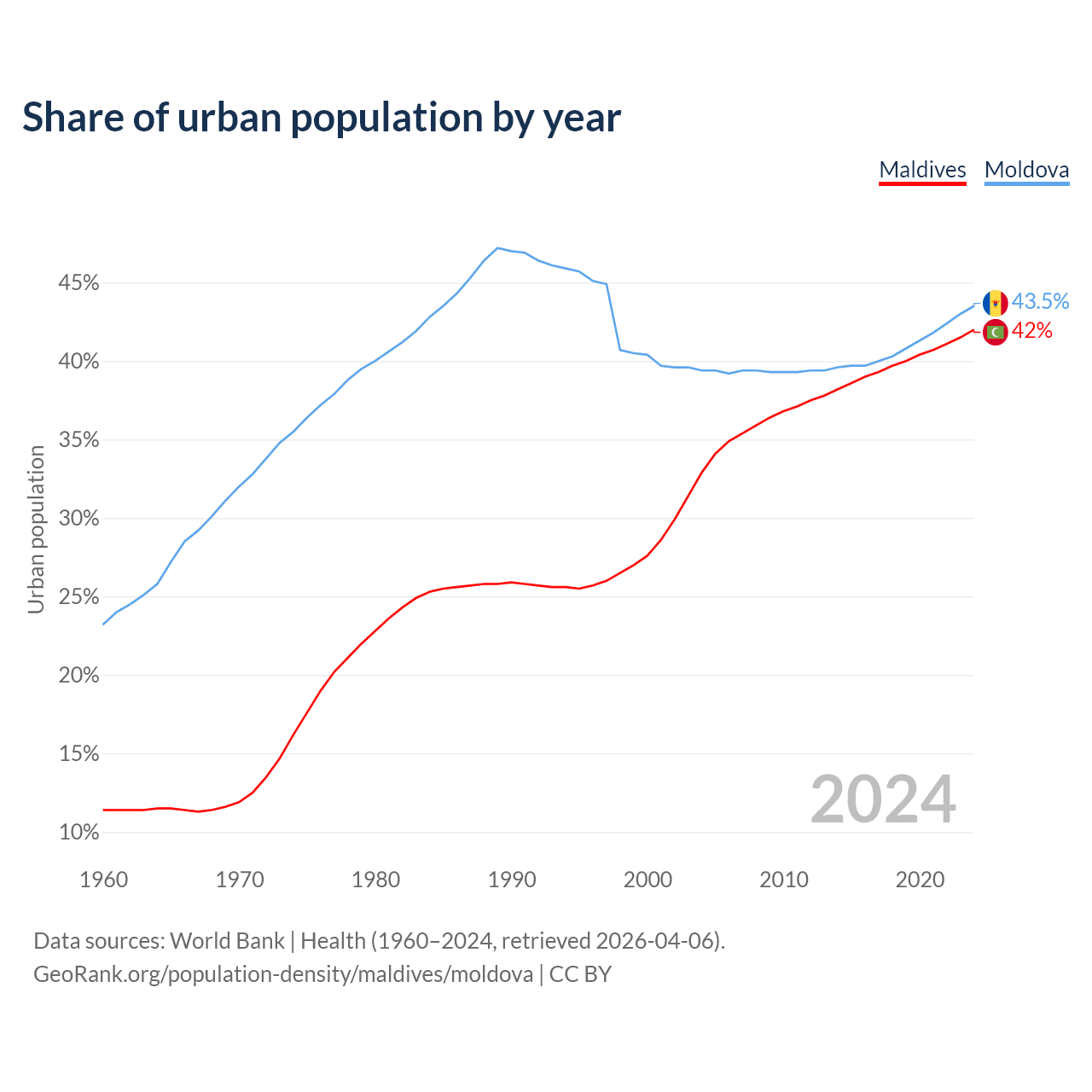 From 2006 to 2026, population density in Maldives increased by 70.5%, compared to a 18.8% decline in Moldova.