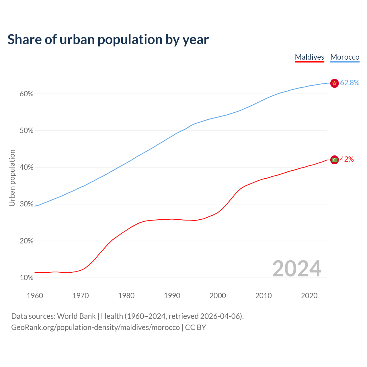 From 2004 to 2024, the share of urban population changed from 32.9% to 42% in Maldives and from 55% to 62.8% in Morocco.