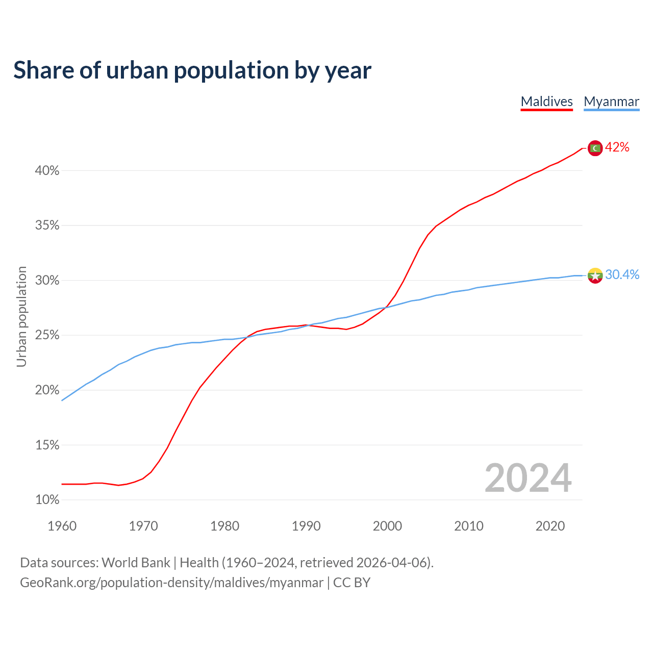 From 2004 to 2024, the share of urban population changed from 32.9% to 42% in Maldives and from 28.2% to 30.4% in Myanmar.