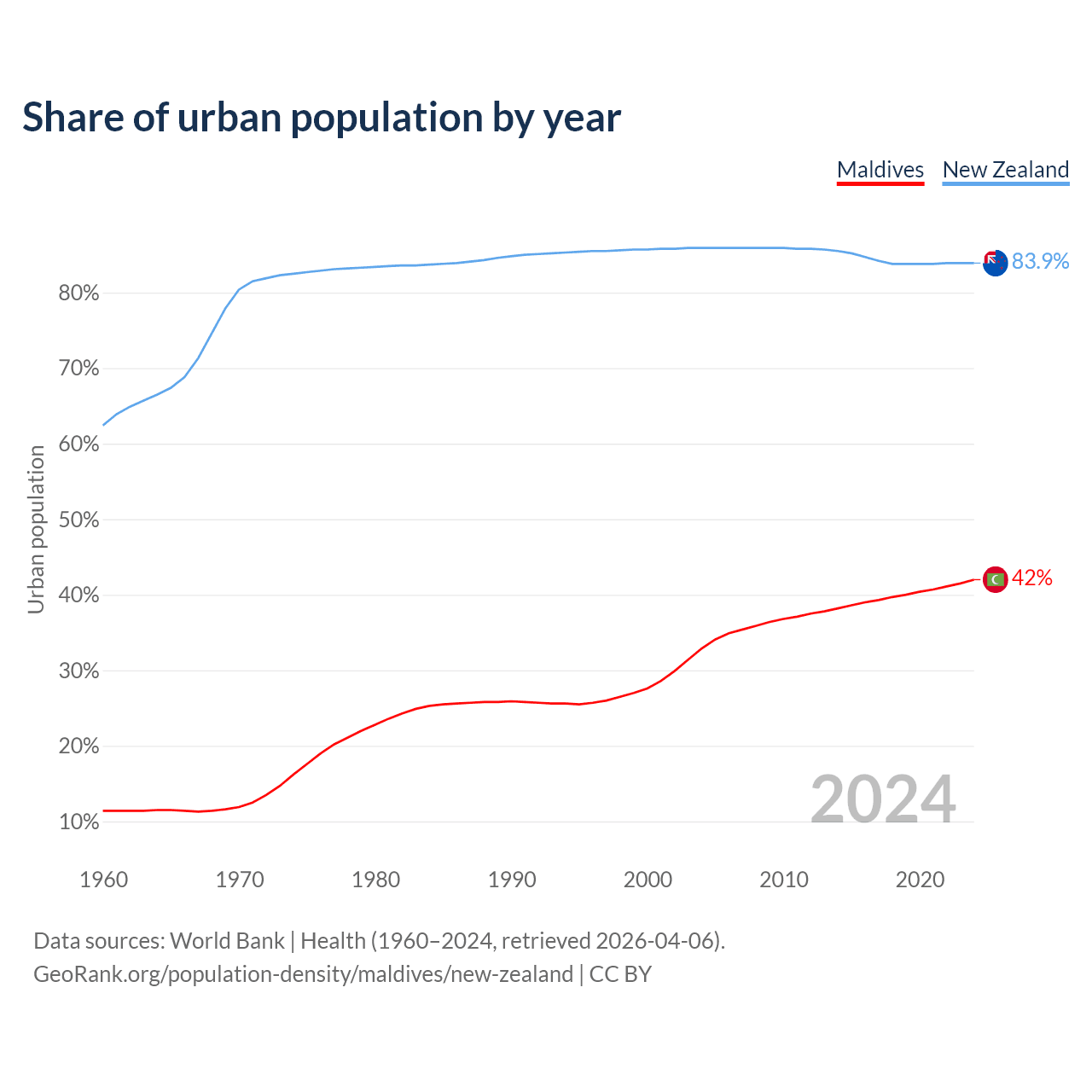 From 2004 to 2024, the share of urban population changed from 32.9% to 42% in Maldives and from 85.9% to 83.9% in New Zealand.