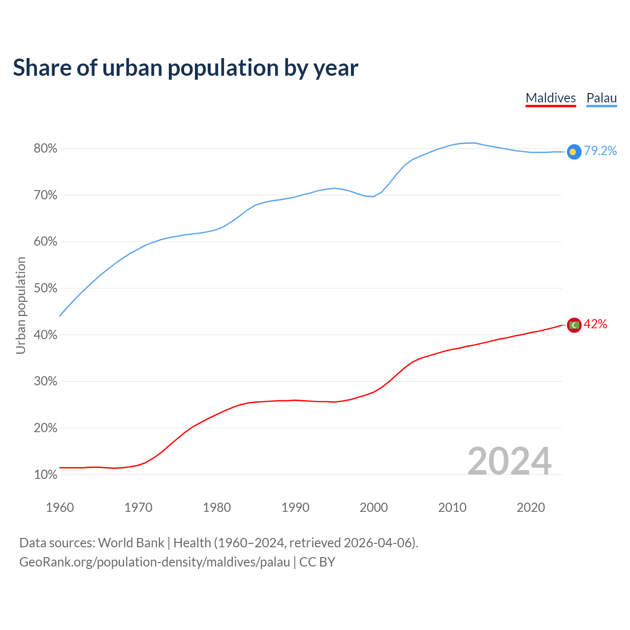 From 2004 to 2024, the share of urban population changed from 32.9% to 42% in Maldives and from 76.4% to 79.2% in Palau.