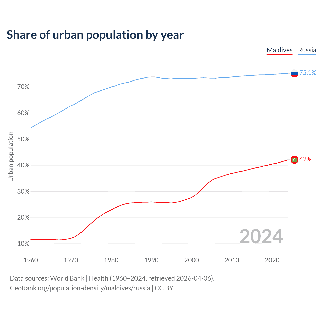 From 2004 to 2024, the share of urban population changed from 32.9% to 42% in Maldives and from 73.3% to 75.1% in Russia.