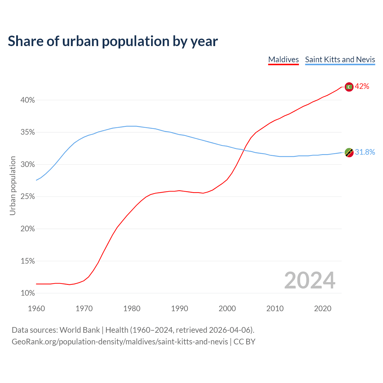 From 2004 to 2024, the share of urban population changed from 32.9% to 42% in Maldives and from 32.1% to 31.8% in Saint Kitts and Nevis.