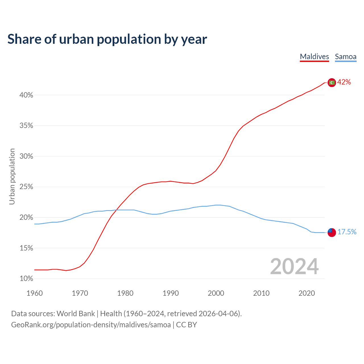 From 2006 to 2026, population density in Maldives increased by 70.5%, compared to a 19.6% growth in Samoa.