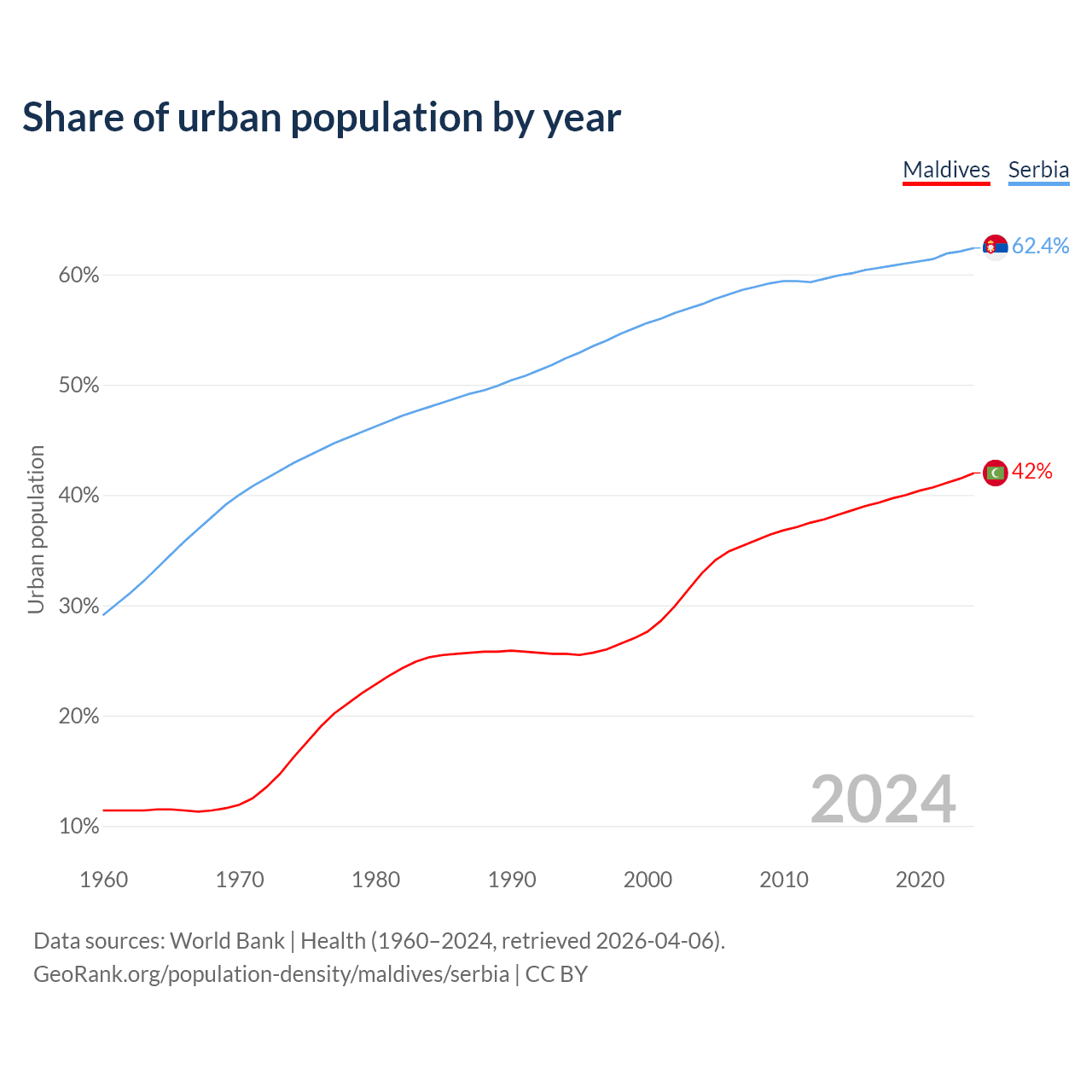 From 2004 to 2024, the share of urban population changed from 32.9% to 42% in Maldives and from 57.3% to 62.4% in Serbia.