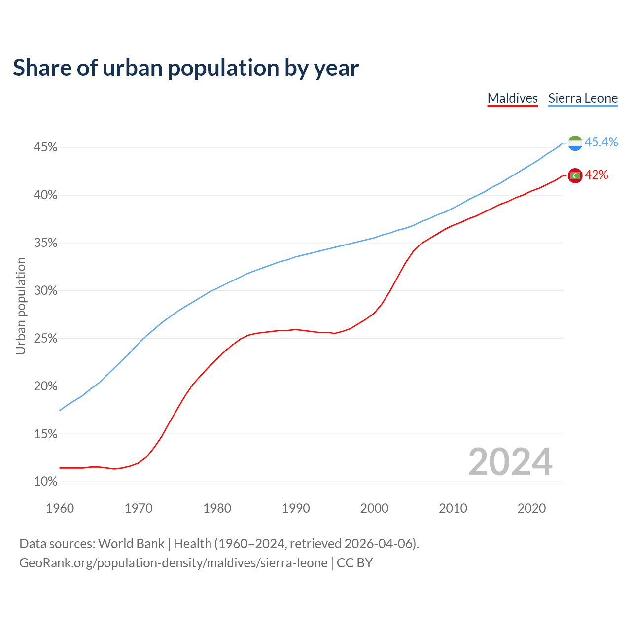 From 2004 to 2024, the share of urban population changed from 32.9% to 42% in Maldives and from 36.5% to 45.4% in Sierra Leone.