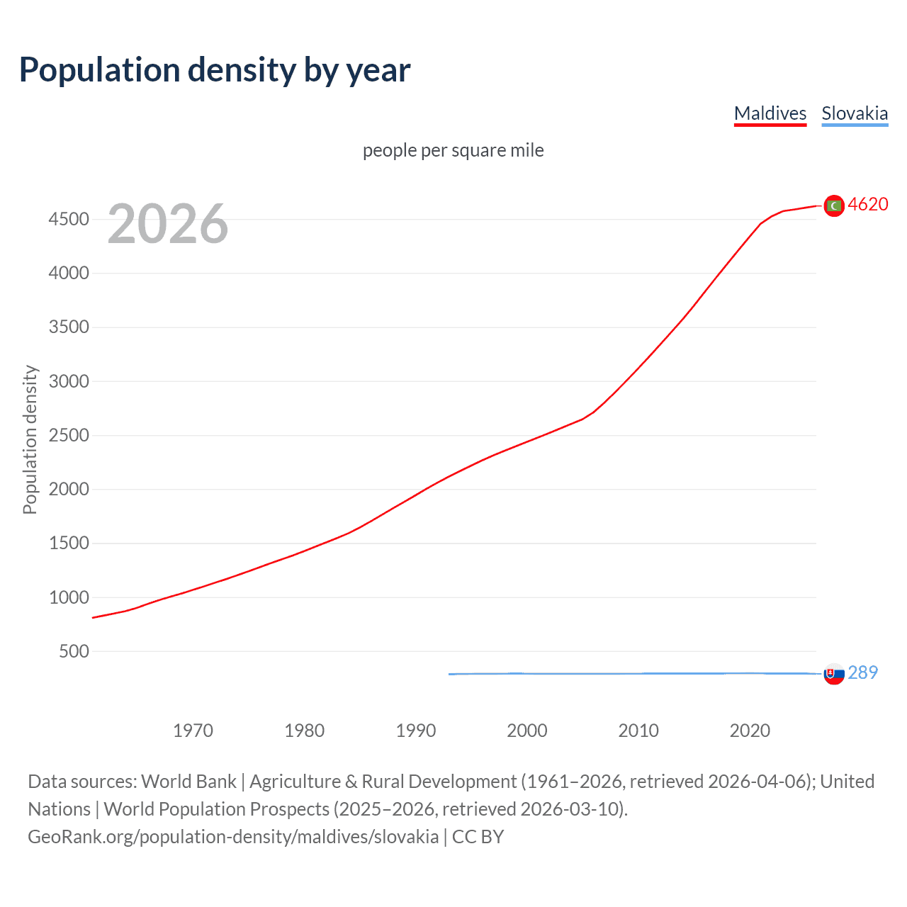 From 2006 to 2026, population density in Maldives increased by 70.5%, compared to a 0.21% decline in Slovakia.