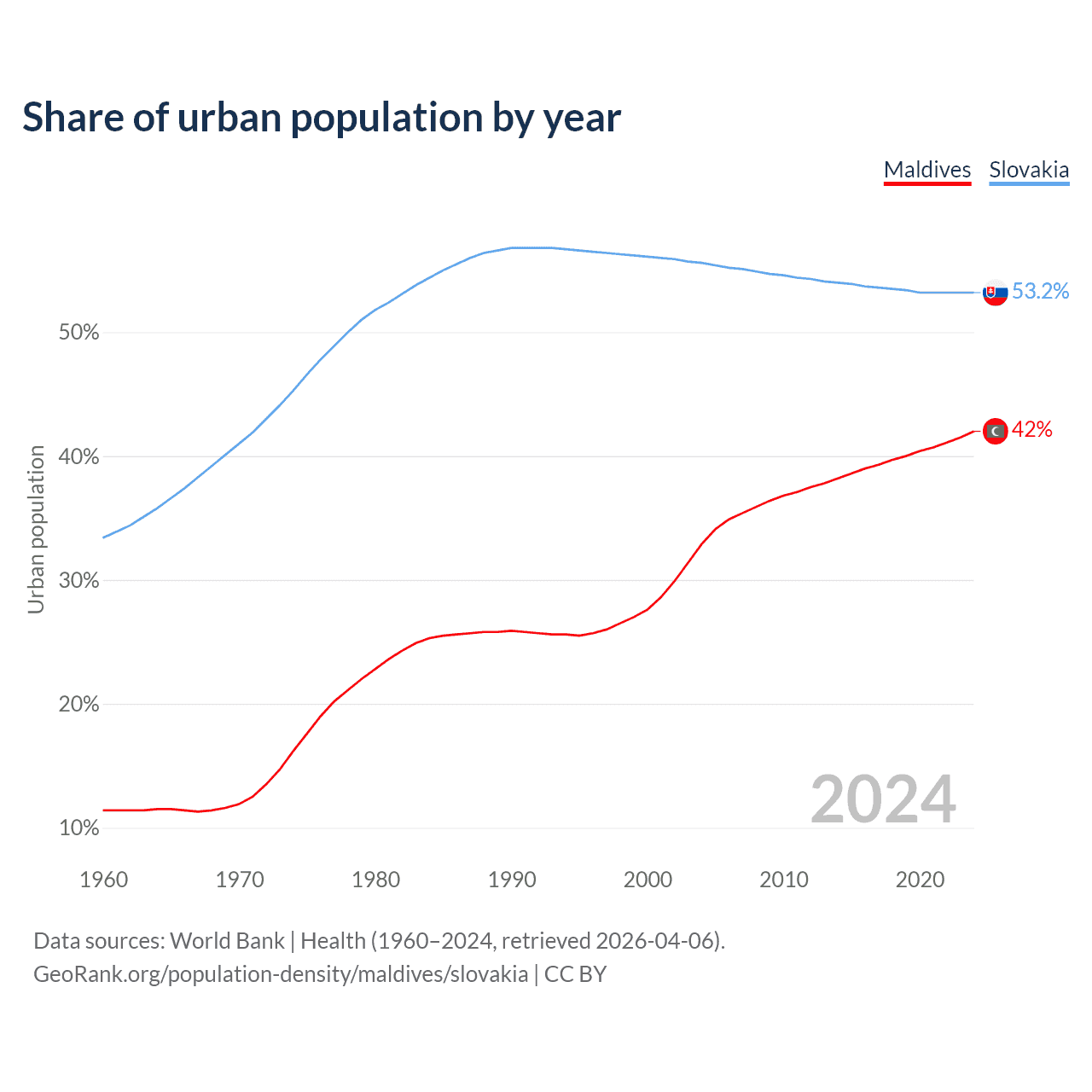 From 2004 to 2024, the share of urban population changed from 32.9% to 42% in Maldives and from 55.6% to 53.2% in Slovakia.