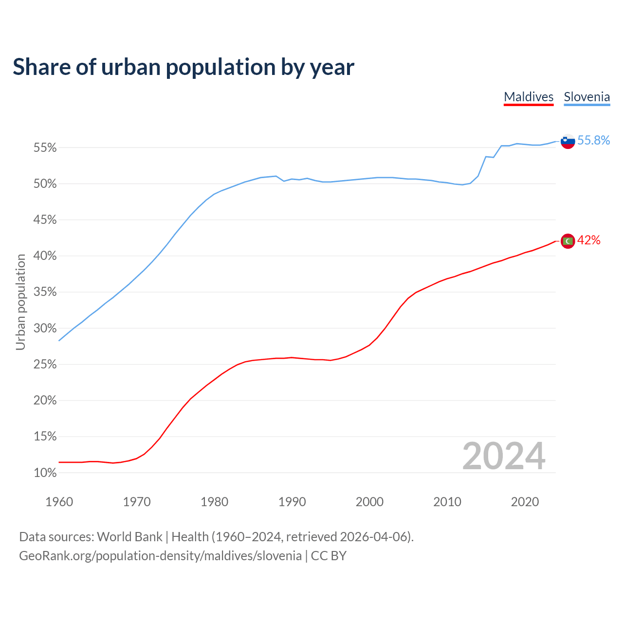 From 2004 to 2024, the share of urban population changed from 32.9% to 42% in Maldives and from 50.7% to 55.8% in Slovenia.