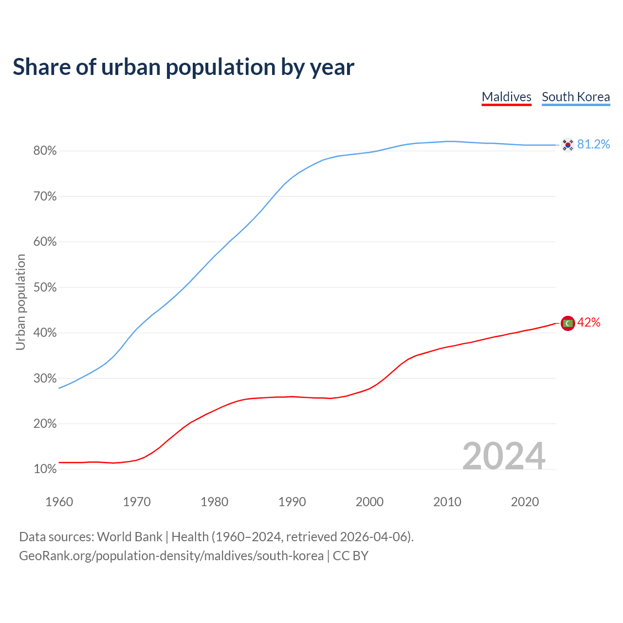 From 2004 to 2024, the share of urban population changed from 32.9% to 42% in Maldives and from 81.1% to 81.2% in South Korea.