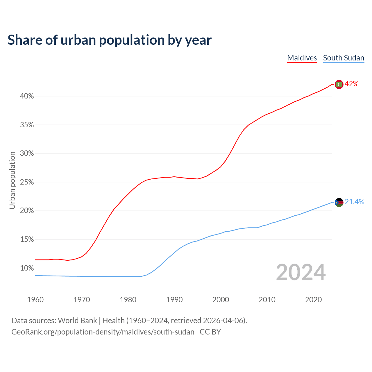 From 2004 to 2024, the share of urban population changed from 32.9% to 42% in Maldives and from 16.8% to 21.4% in South Sudan.