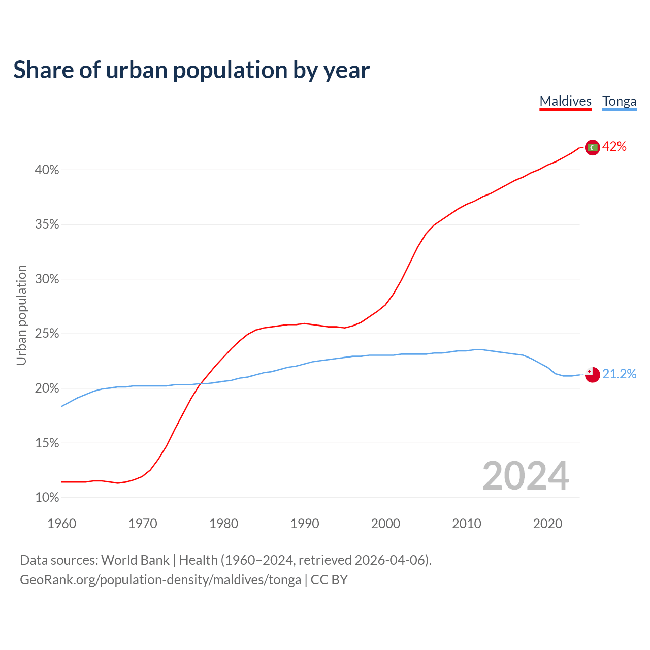 From 2004 to 2024, the share of urban population changed from 32.9% to 42% in Maldives and from 23.1% to 21.2% in Tonga.