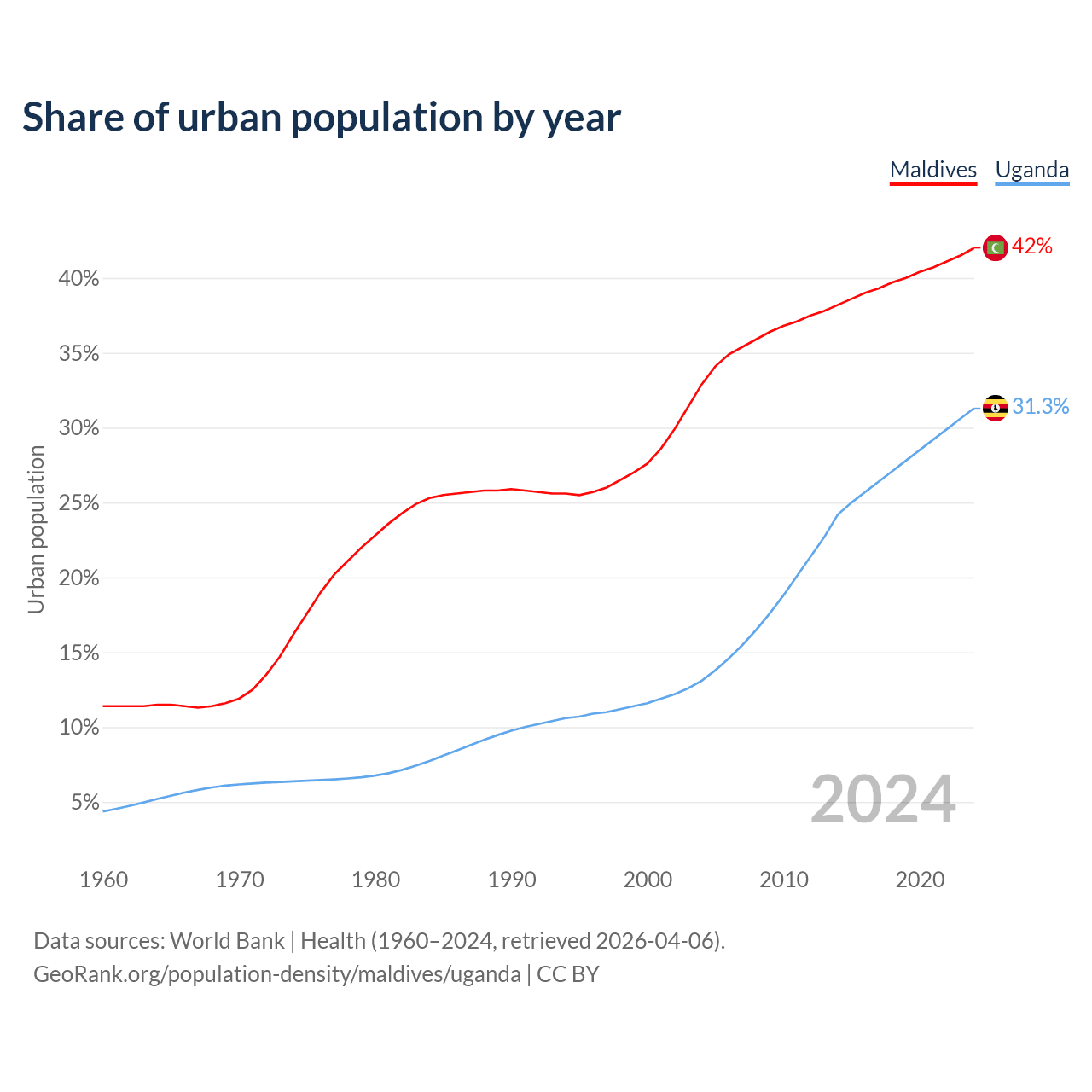 From 2004 to 2024, the share of urban population changed from 32.9% to 42% in Maldives and from 13.1% to 31.3% in Uganda.