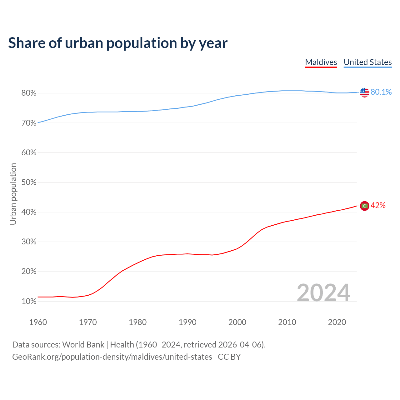From 2006 to 2026, population density in Maldives increased by 70.5%, compared to a 15.3% growth in the United States.