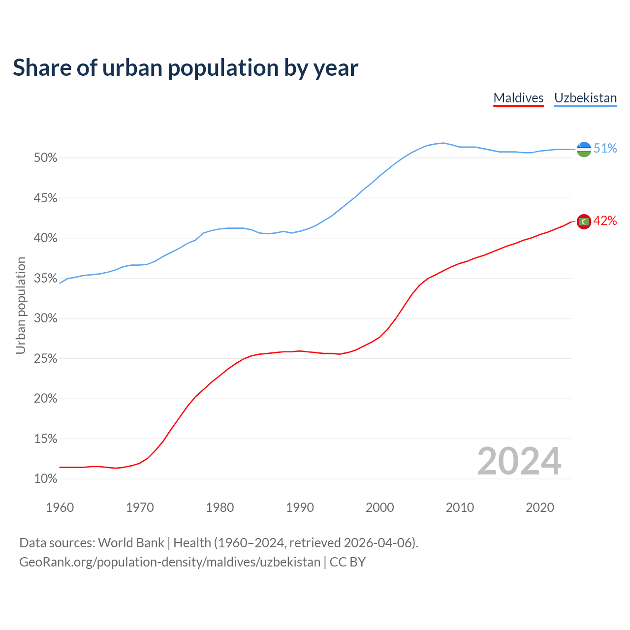 From 2004 to 2024, the share of urban population changed from 32.9% to 42% in Maldives and from 50.6% to 51% in Uzbekistan.