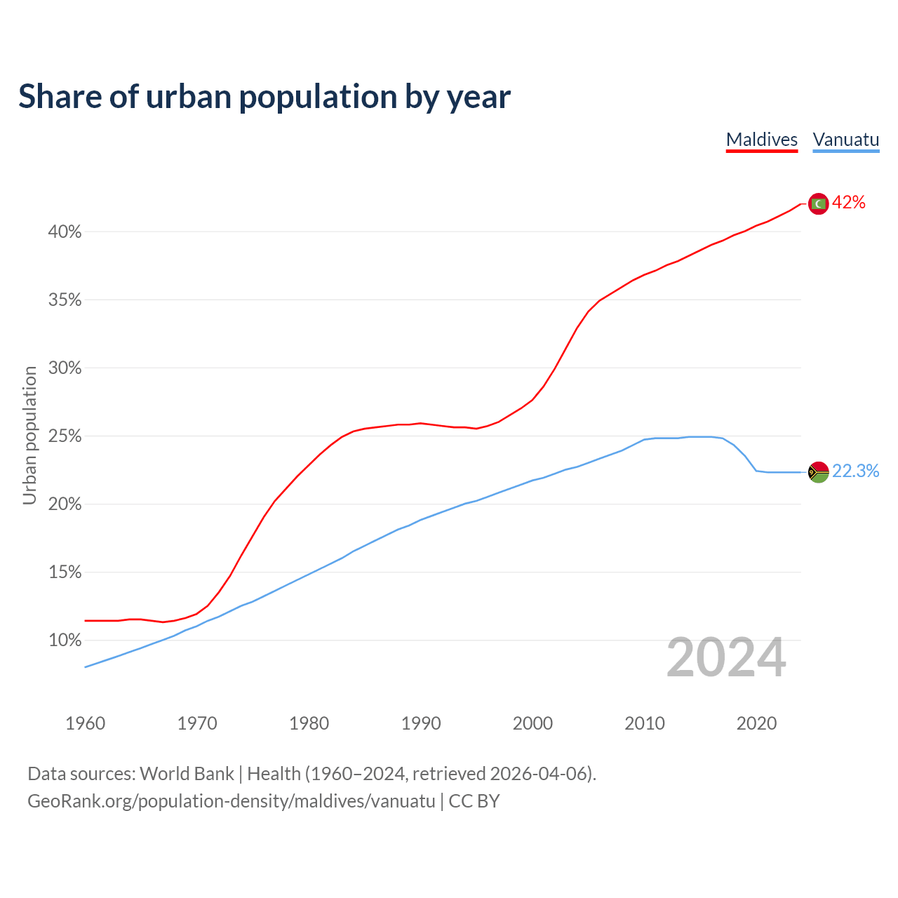 From 2006 to 2026, population density in Maldives increased by 70.5%, compared to a 58.7% growth in Vanuatu.