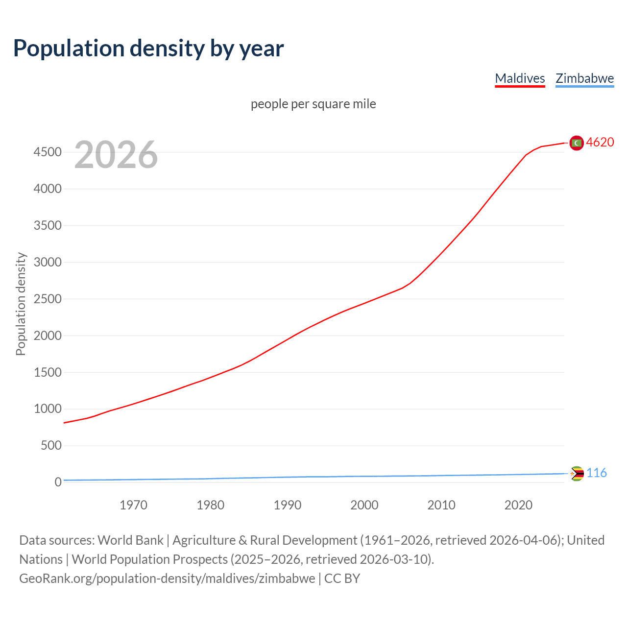 From 2006 to 2026, population density in Maldives increased by 70.5%, compared to a 36.7% growth in Zimbabwe.