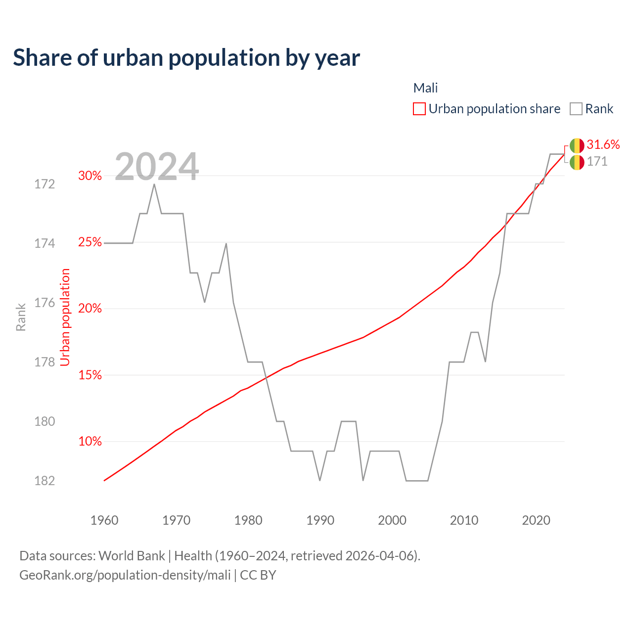This chart shows the share of urban population in Mali from 1960 to 2024: 7.02% lived in urban areas in 1960, 19% in 2000, and 31.6% in 2024.