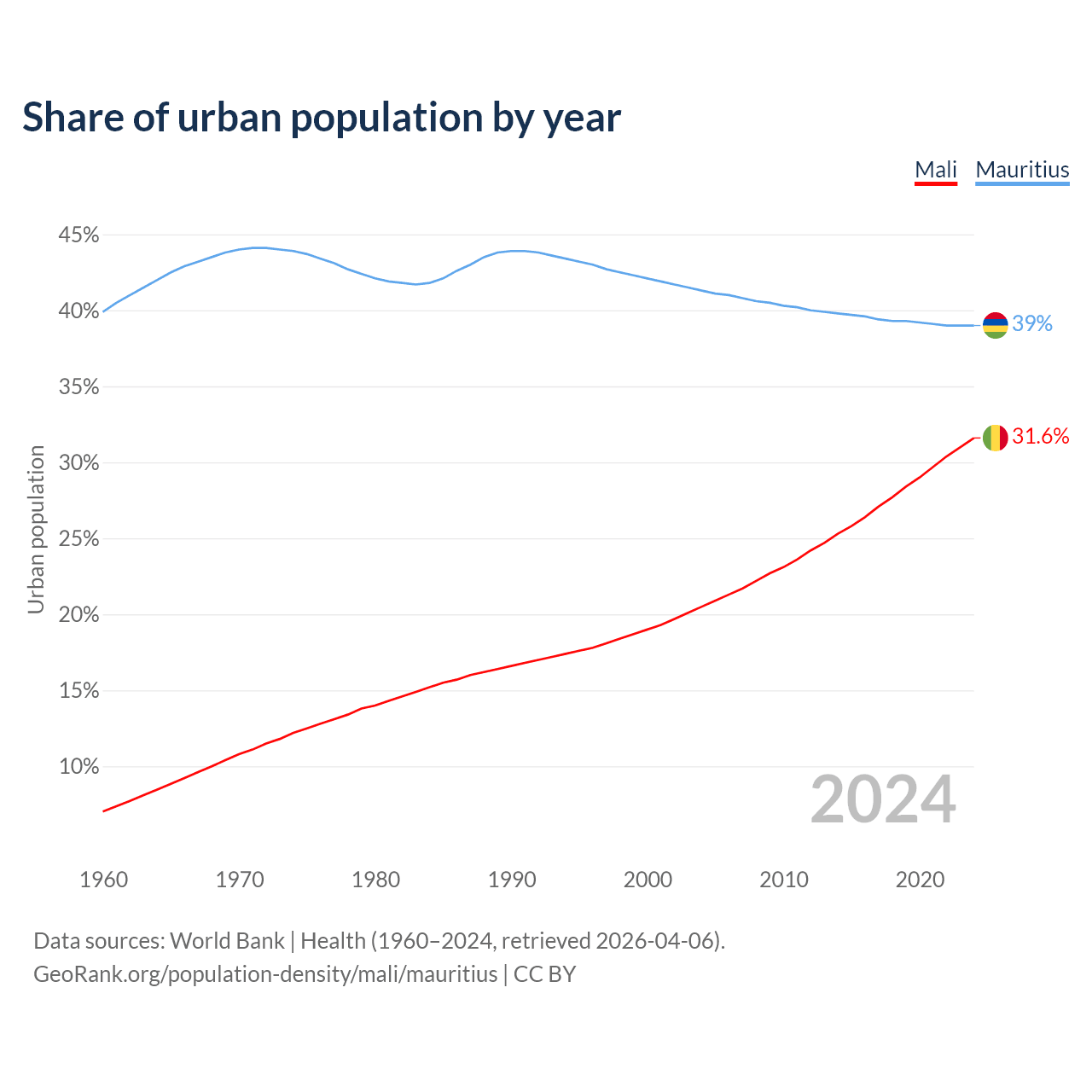 From 2004 to 2024, the share of urban population changed from 20.5% to 31.6% in Mali and from 41.3% to 39% in Mauritius.