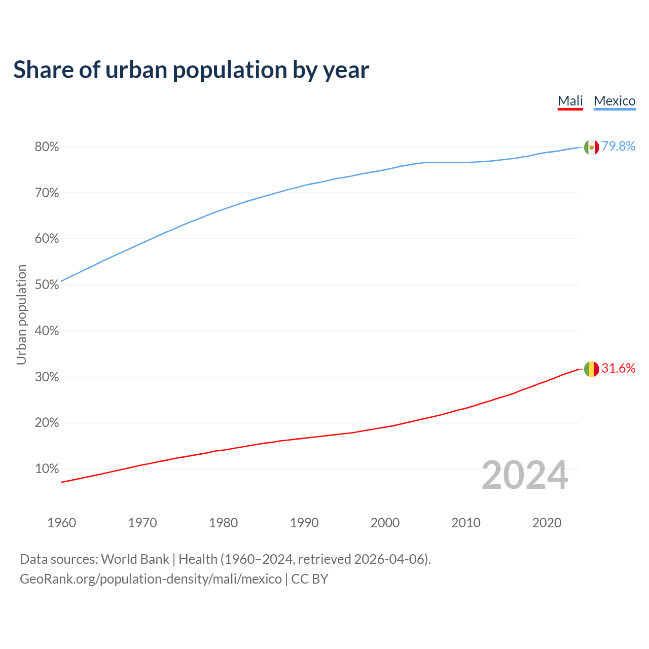 From 2004 to 2024, the share of urban population changed from 20.5% to 31.6% in Mali and from 76.3% to 79.8% in Mexico.