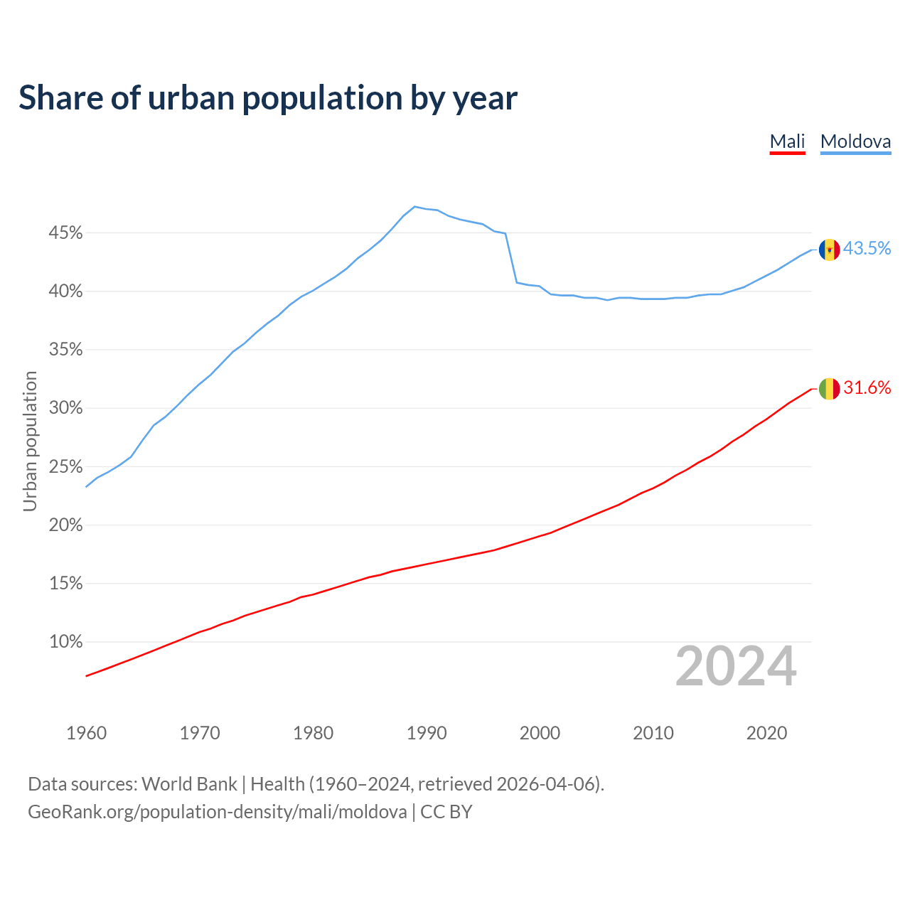 From 2004 to 2024, the share of urban population changed from 20.5% to 31.6% in Mali and from 39.4% to 43.5% in Moldova.