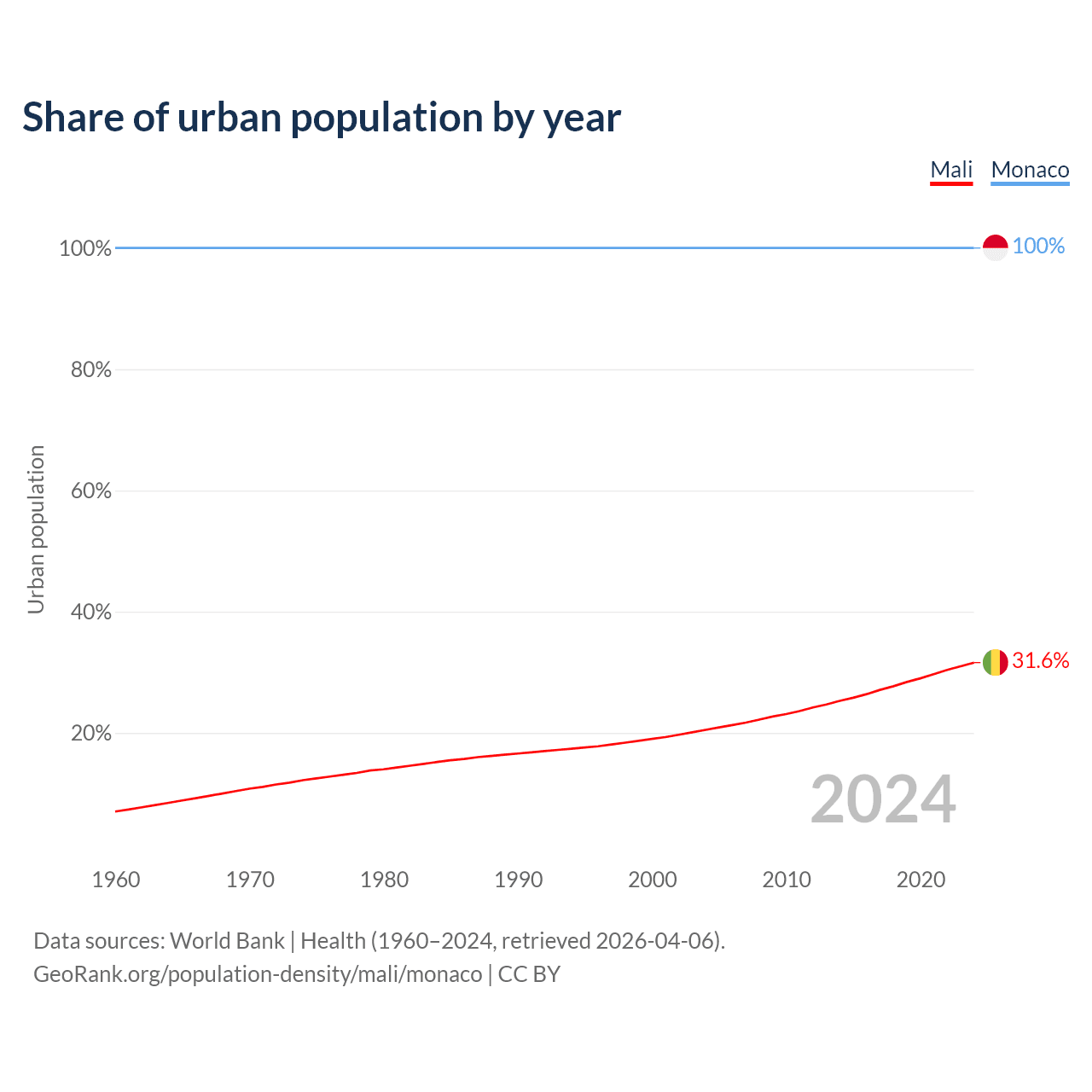 From 2004 to 2024, the share of urban population changed from 20.5% to 31.6% in Mali and from 100% to 100% in Monaco.