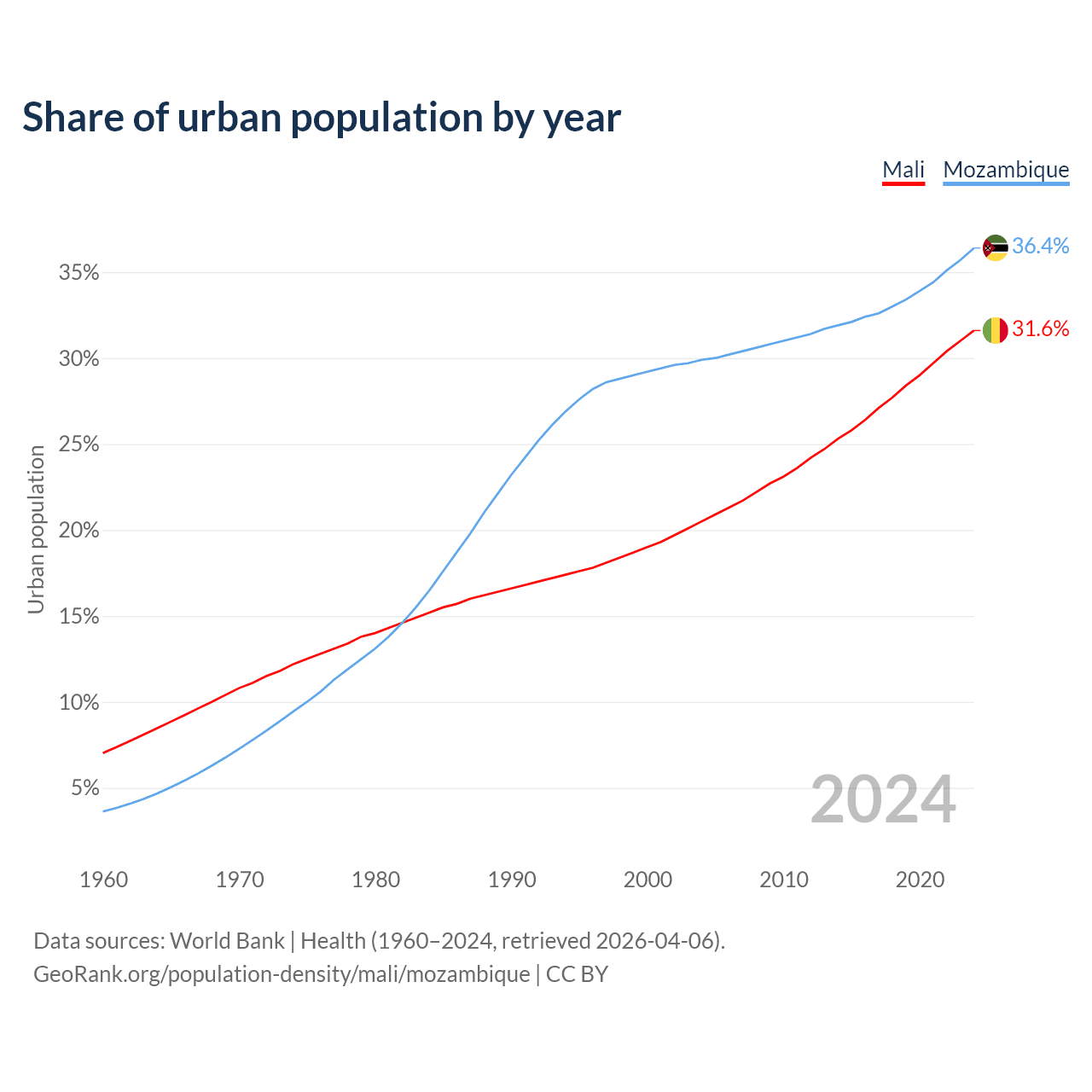 From 2004 to 2024, the share of urban population changed from 20.5% to 31.6% in Mali and from 29.9% to 36.4% in Mozambique.