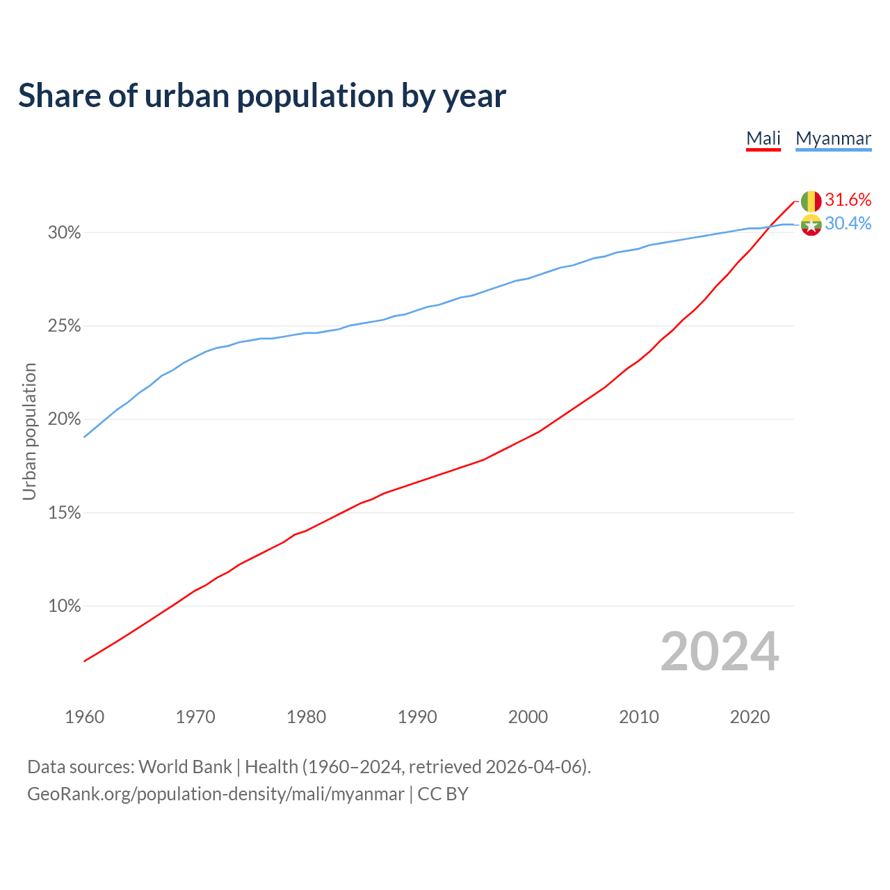 From 2004 to 2024, the share of urban population changed from 20.5% to 31.6% in Mali and from 28.2% to 30.4% in Myanmar.
