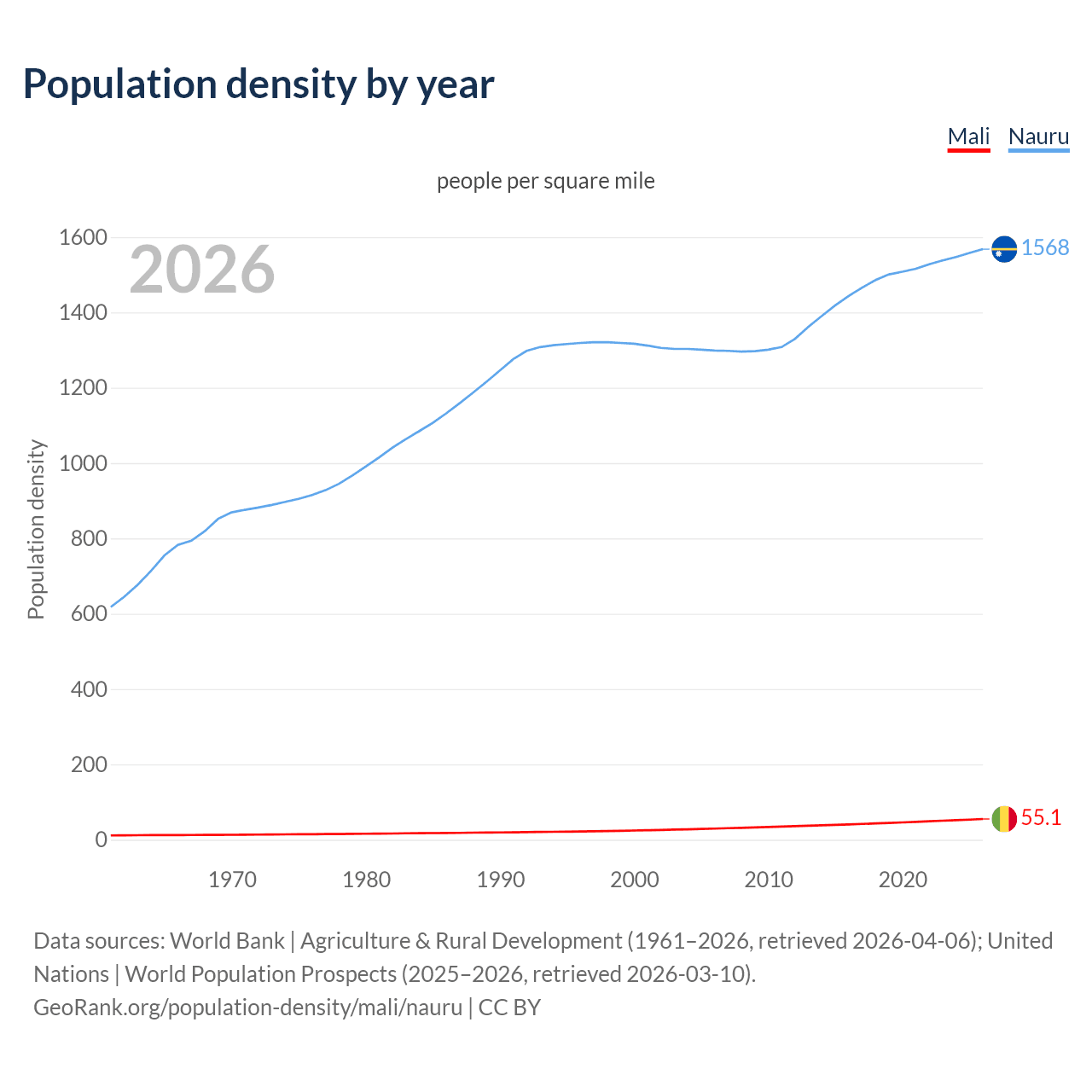 From 2006 to 2026, population density in Mali increased by 85.4%, compared to a 20.6% growth in Nauru.