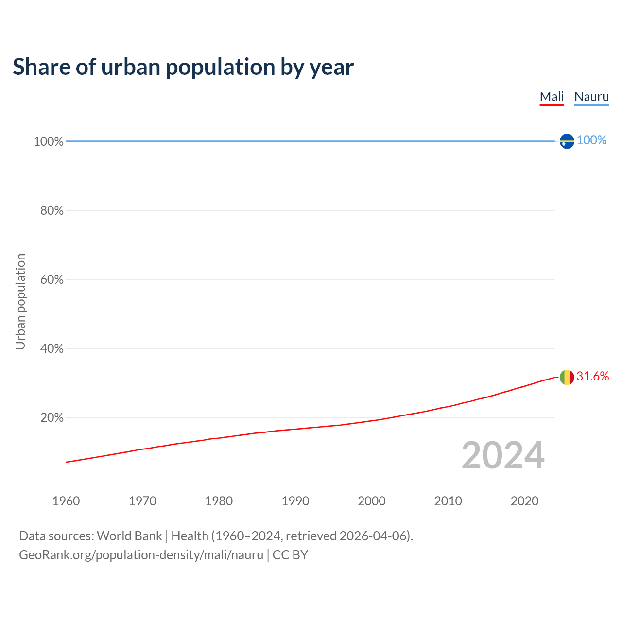 From 2004 to 2024, the share of urban population changed from 20.5% to 31.6% in Mali and from 100% to 100% in Nauru.
