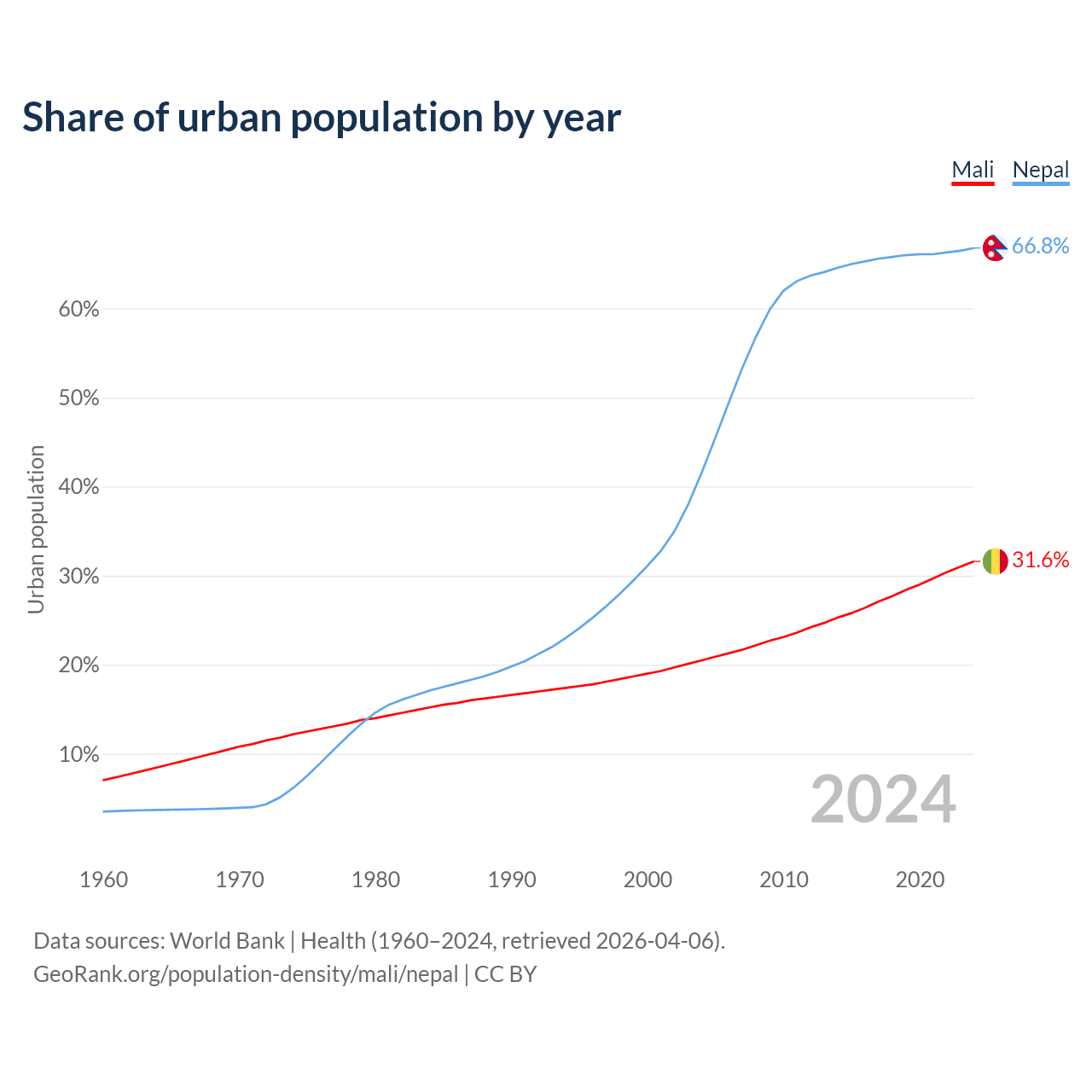 From 2004 to 2024, the share of urban population changed from 20.5% to 31.6% in Mali and from 41.6% to 66.8% in Nepal.