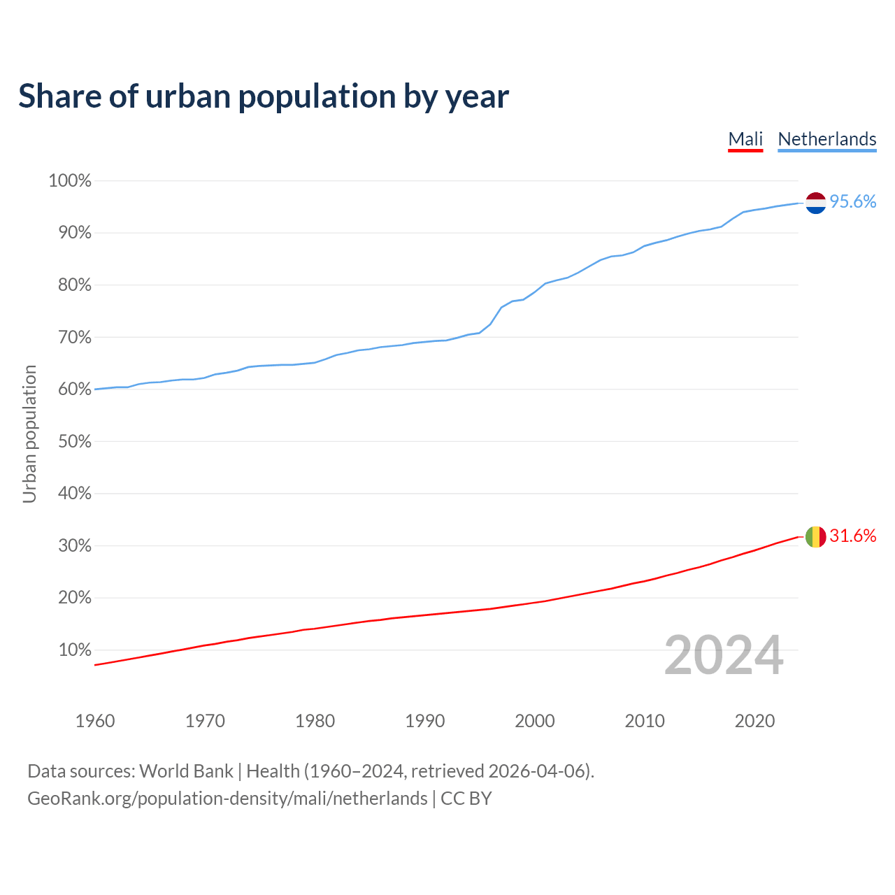 From 2004 to 2024, the share of urban population changed from 20.5% to 31.6% in Mali and from 82.3% to 95.6% in the Netherlands.