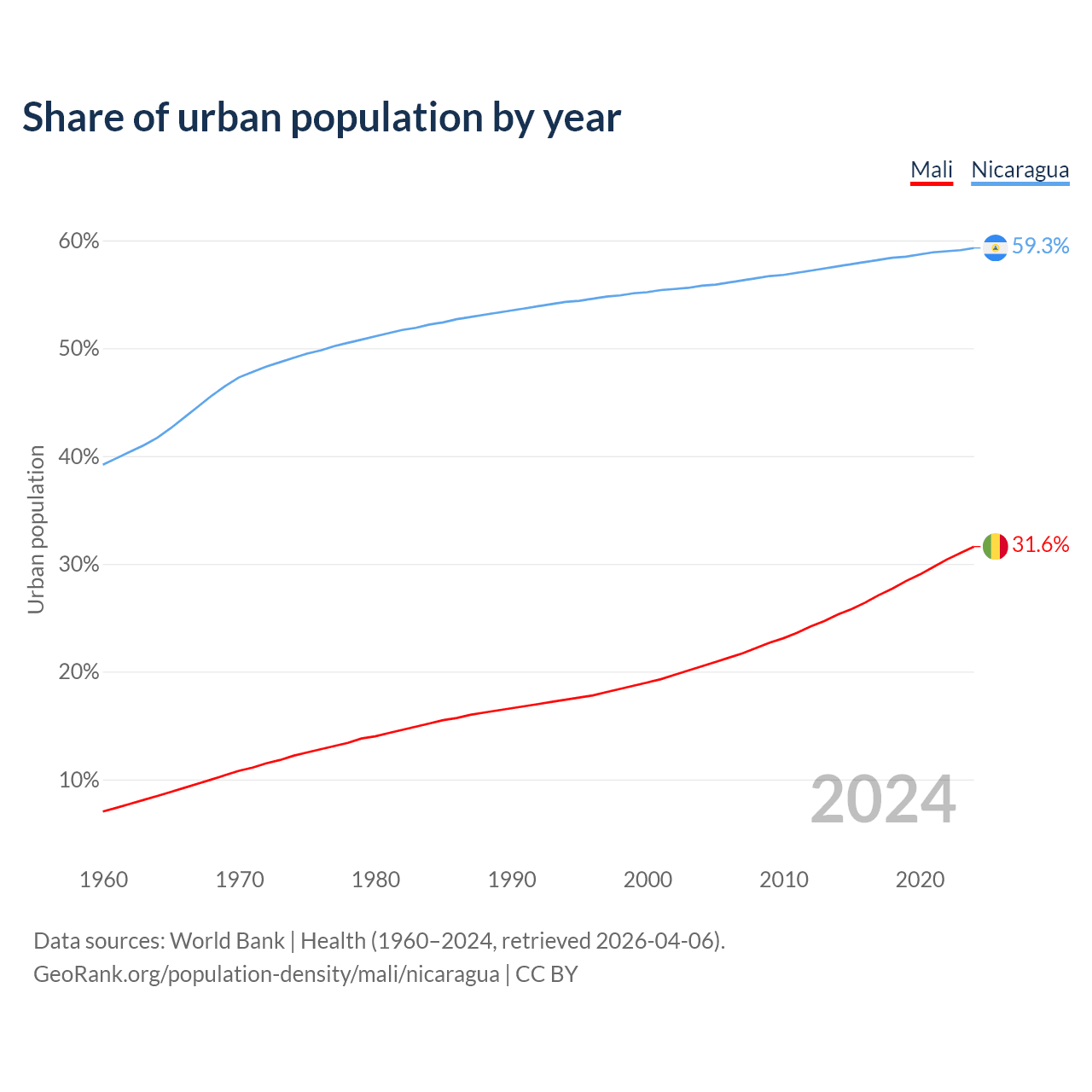 From 2004 to 2024, the share of urban population changed from 20.5% to 31.6% in Mali and from 55.8% to 59.3% in Nicaragua.