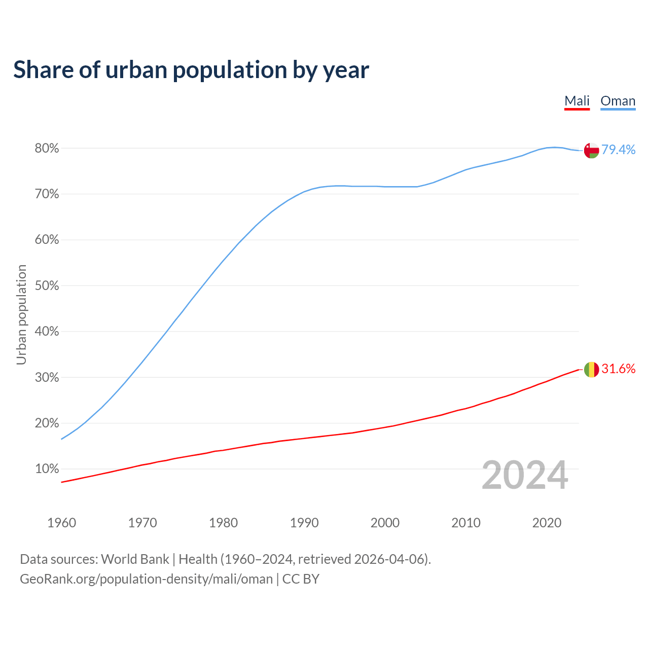 From 2004 to 2024, the share of urban population changed from 20.5% to 31.6% in Mali and from 71.5% to 79.4% in Oman.
