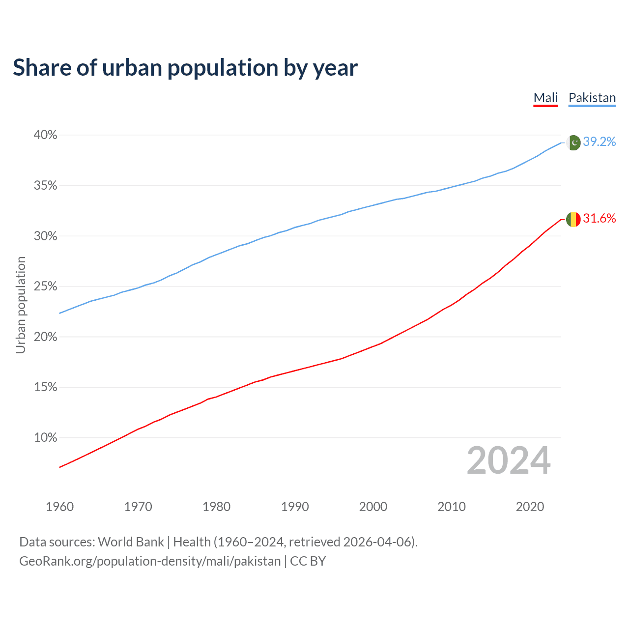 From 2004 to 2024, the share of urban population changed from 20.5% to 31.6% in Mali and from 33.7% to 39.2% in Pakistan.