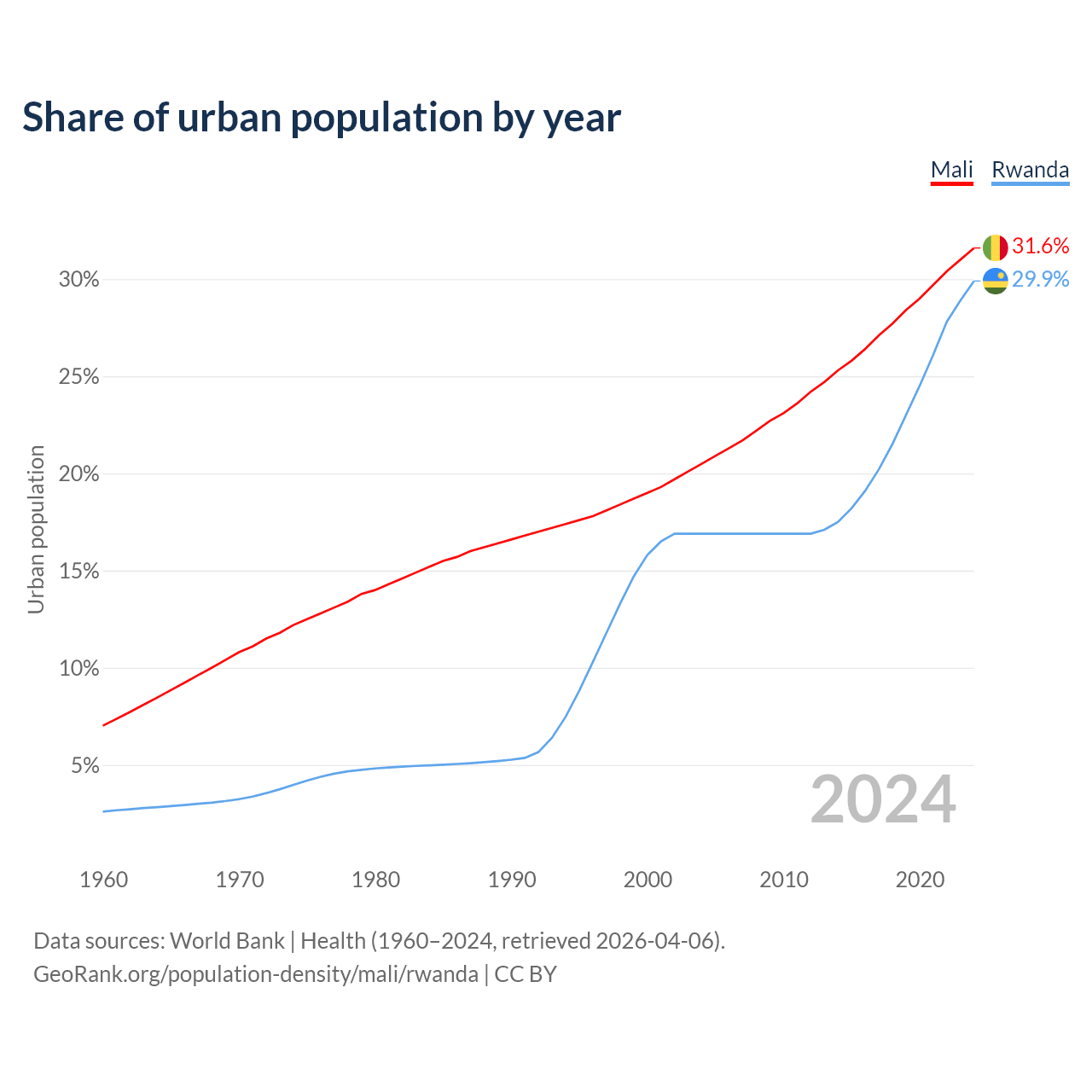 From 2004 to 2024, the share of urban population changed from 20.5% to 31.6% in Mali and from 16.9% to 29.9% in Rwanda.