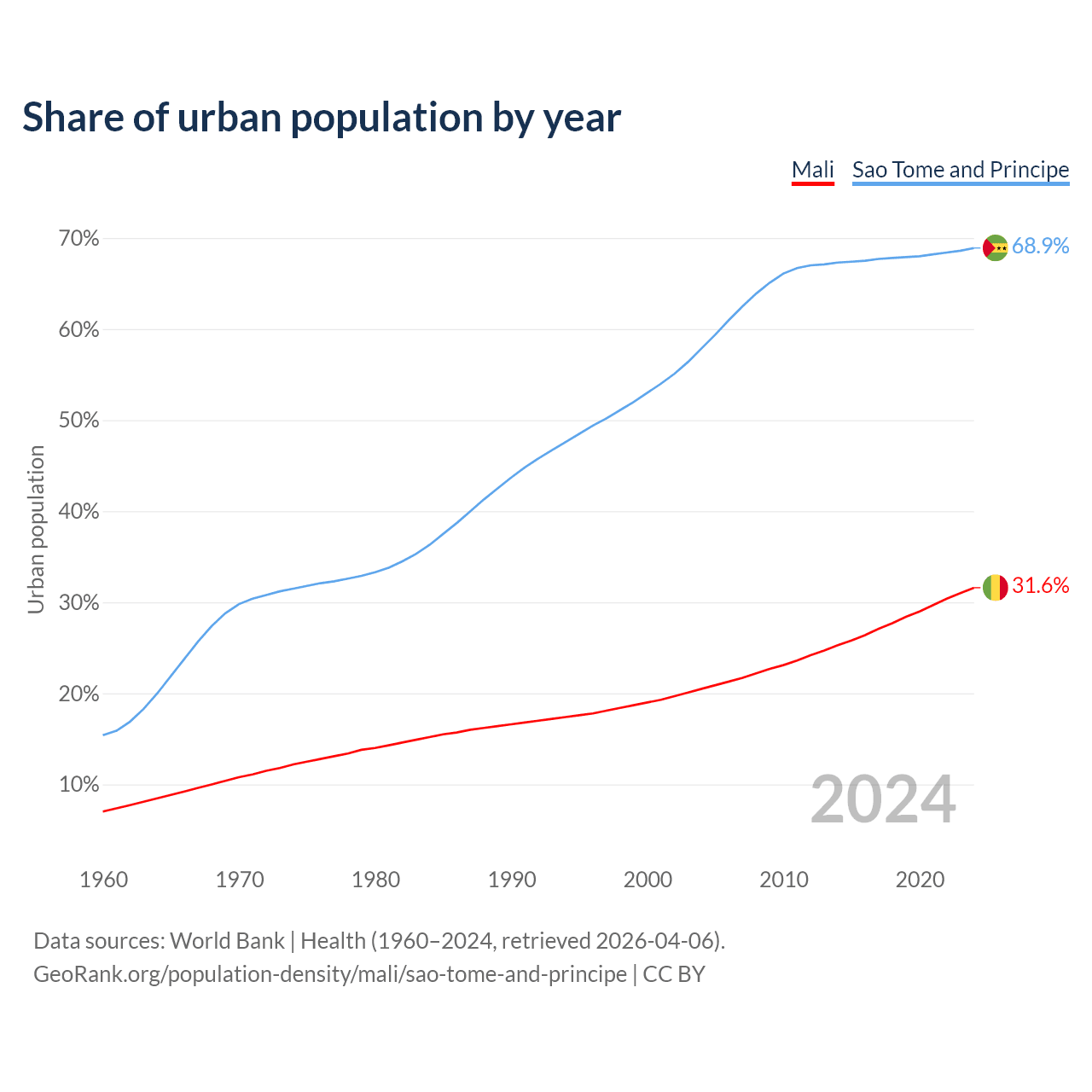 From 2004 to 2024, the share of urban population changed from 20.5% to 31.6% in Mali and from 57.9% to 68.9% in Sao Tome and Principe.
