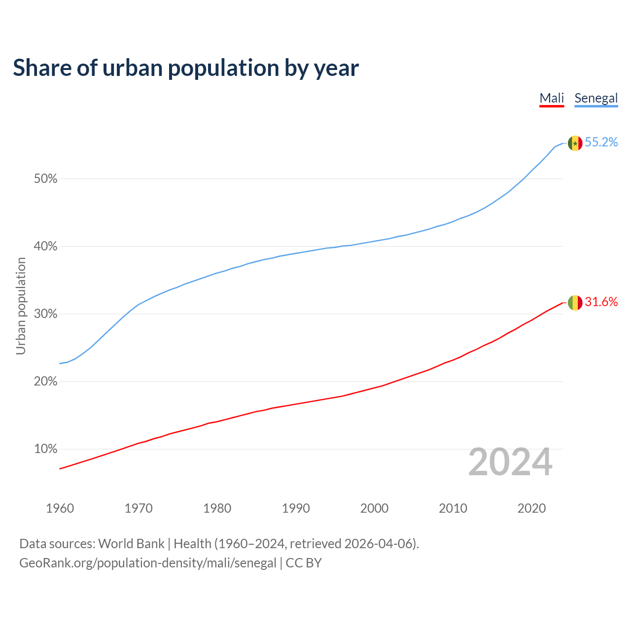 From 2004 to 2024, the share of urban population changed from 20.5% to 31.6% in Mali and from 41.6% to 55.2% in Senegal.