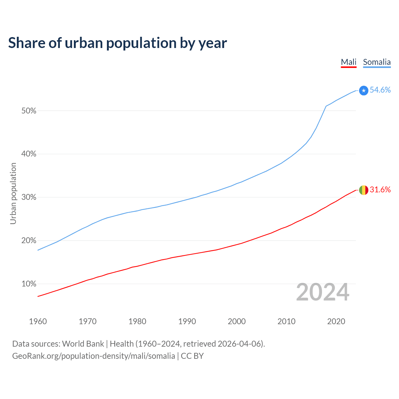 From 2004 to 2024, the share of urban population changed from 20.5% to 31.6% in Mali and from 35% to 54.6% in Somalia.