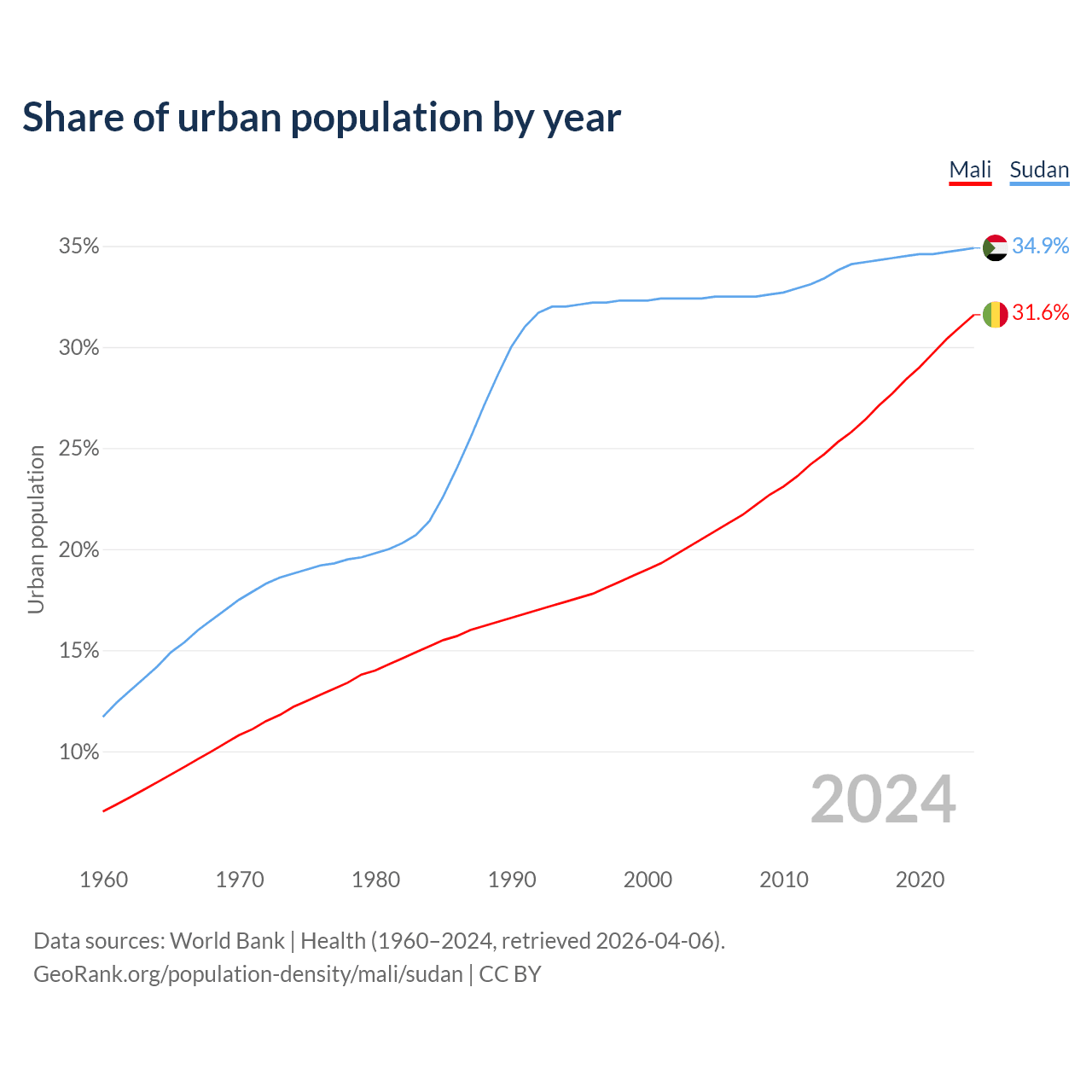 From 2004 to 2024, the share of urban population changed from 20.5% to 31.6% in Mali and from 32.4% to 34.9% in Sudan.